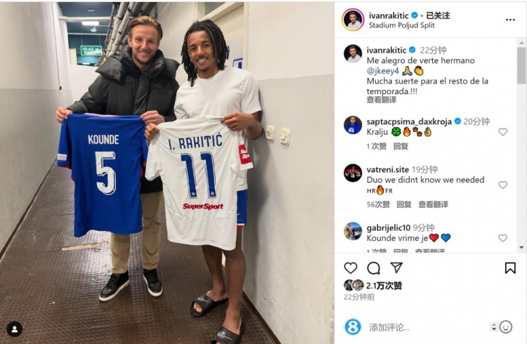 3月21日訊 歐國聯1/4決賽首回合比賽,法國客場0-2不敵克羅地亞。目前效力于哈伊杜克的拉基蒂奇社媒曬出與孔德互換球衣的照片,配文:“很高興見到你,我的兄弟孔德,祝你在本賽季余下的比賽中好運!” 本文標簽: 足球 西甲 巴塞羅那 法國 克羅地亞