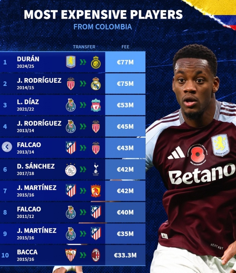 2月1日訊 利雅得勝利已經官宣7700萬歐基礎轉會費簽下維拉前鋒杜蘭,數據統計顯示這也打破了哥倫比亞籍球員的歷史轉會費紀錄。