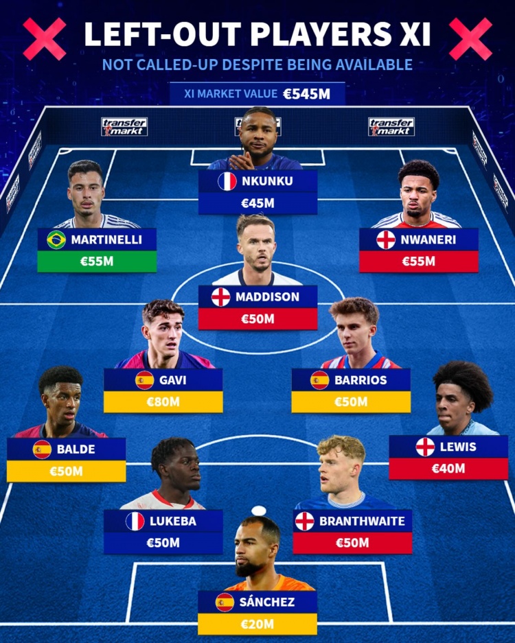 3月21日訊 德國轉會市場排出了落選國家隊的球員陣容,恩昆庫、馬丁內利、恩瓦內里、加維在列,總價5.45億歐元。落選國家隊陣容(總價5.45億歐,不包含傷缺球員):門將:羅伯特-桑切斯(西班牙)后衛:巴爾德(西班牙)、盧克巴(法國)、布蘭斯維特(英格蘭)、劉易斯(英格蘭)中場:加維(西班牙)、巴里奧斯(西班牙)、麥迪遜(英格蘭)前鋒:馬丁內利(巴西)、恩昆庫(法國)、恩瓦內里(英格蘭) 本文標簽: 足球 英格蘭 法國 巴西 西班牙 英超 切爾西 西甲 巴塞羅那 阿森納