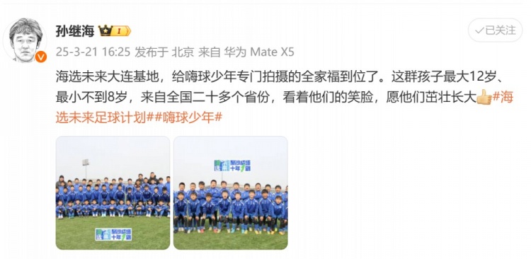 3月21日訊 孫繼海更新社媒,曬出“海選未來”項目大連基地孩子的照片。孫繼海寫道:海選未來大連基地,給嗨球少年專門拍攝的全家福到位了。這群孩子最大12歲、最小不到8歲,來自全國二十多個省份,看著他們的笑臉,愿他們茁壯長大。孫繼海的“海選未來”足球計劃旨在培養能夠立足英超的中國國腳,強調體教融合,致力于發掘全國各地有足球天賦的孩子。 本文標簽: 足球 中超 中國足球