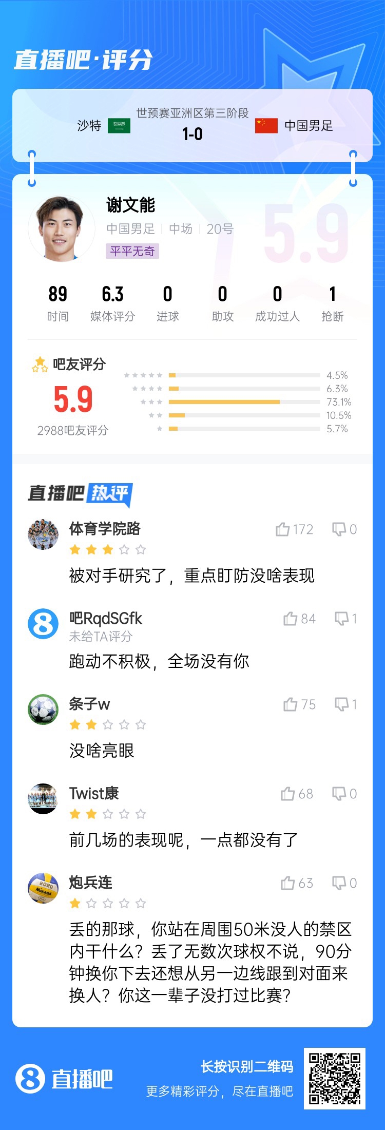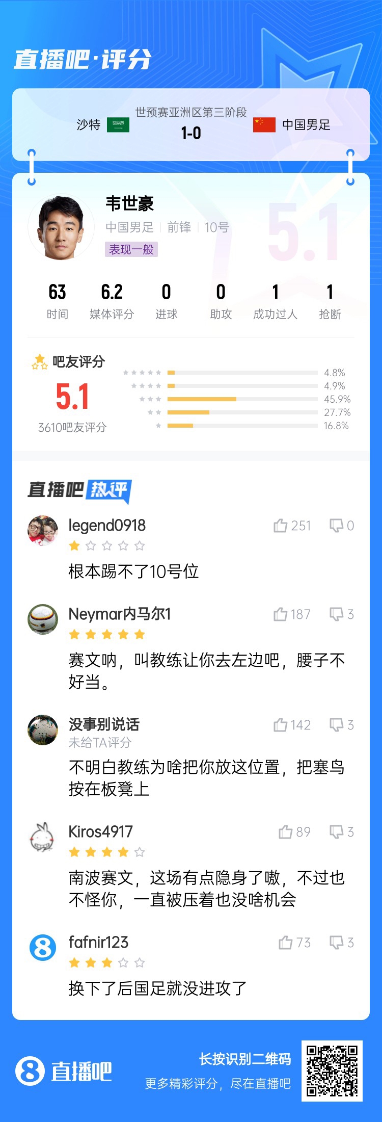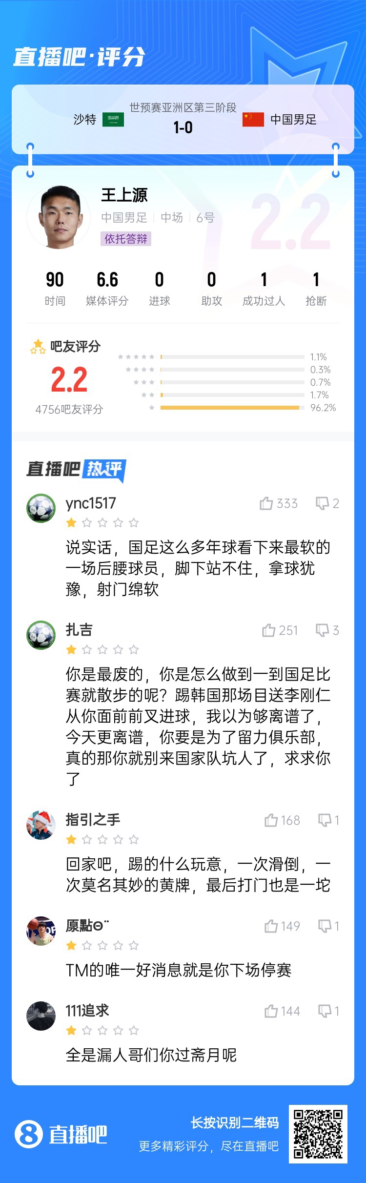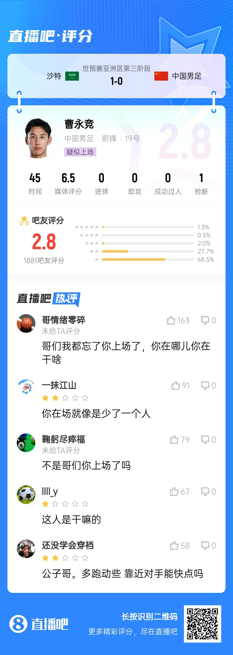 18強賽關鍵戰,國足0-1不敵沙特,沒能擺脫小組墊底。吧友評分中,國足中場球員普遍低分,韋世豪5.1分,王上源2.2分,曹永競2.8分,謝文能5.9分。