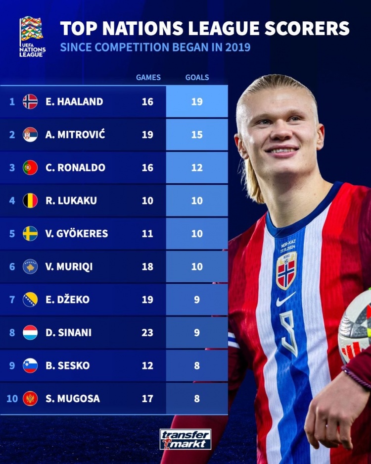 3月21日訊 歐國(guó)聯(lián)賽事戰(zhàn)火重燃,《轉(zhuǎn)會(huì)市場(chǎng)》也統(tǒng)計(jì)了歐國(guó)聯(lián)歷史射手榜,哈蘭德居首。