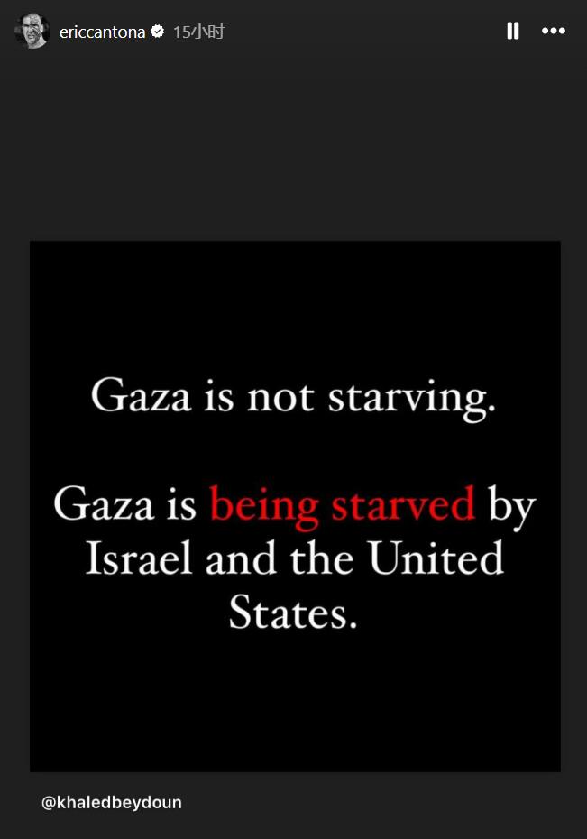 03月21日訊 前曼聯球星坎通納在社媒轉發快拍,聲援加沙民眾。快拍內容:“加沙沒有陷入饑荒 是以色列和美國想餓死加沙”