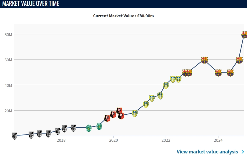 本賽季28歲的拉菲尼亞狀態(tài)優(yōu)異,各賽事42場(chǎng)比賽打進(jìn)27球,并有20次助攻,場(chǎng)均制造一球的同時(shí)也幫助巴薩多線爭(zhēng)冠,創(chuàng)造生涯最佳表現(xiàn)的他身價(jià)卻與去年12月份相同,仍為8000萬歐元。