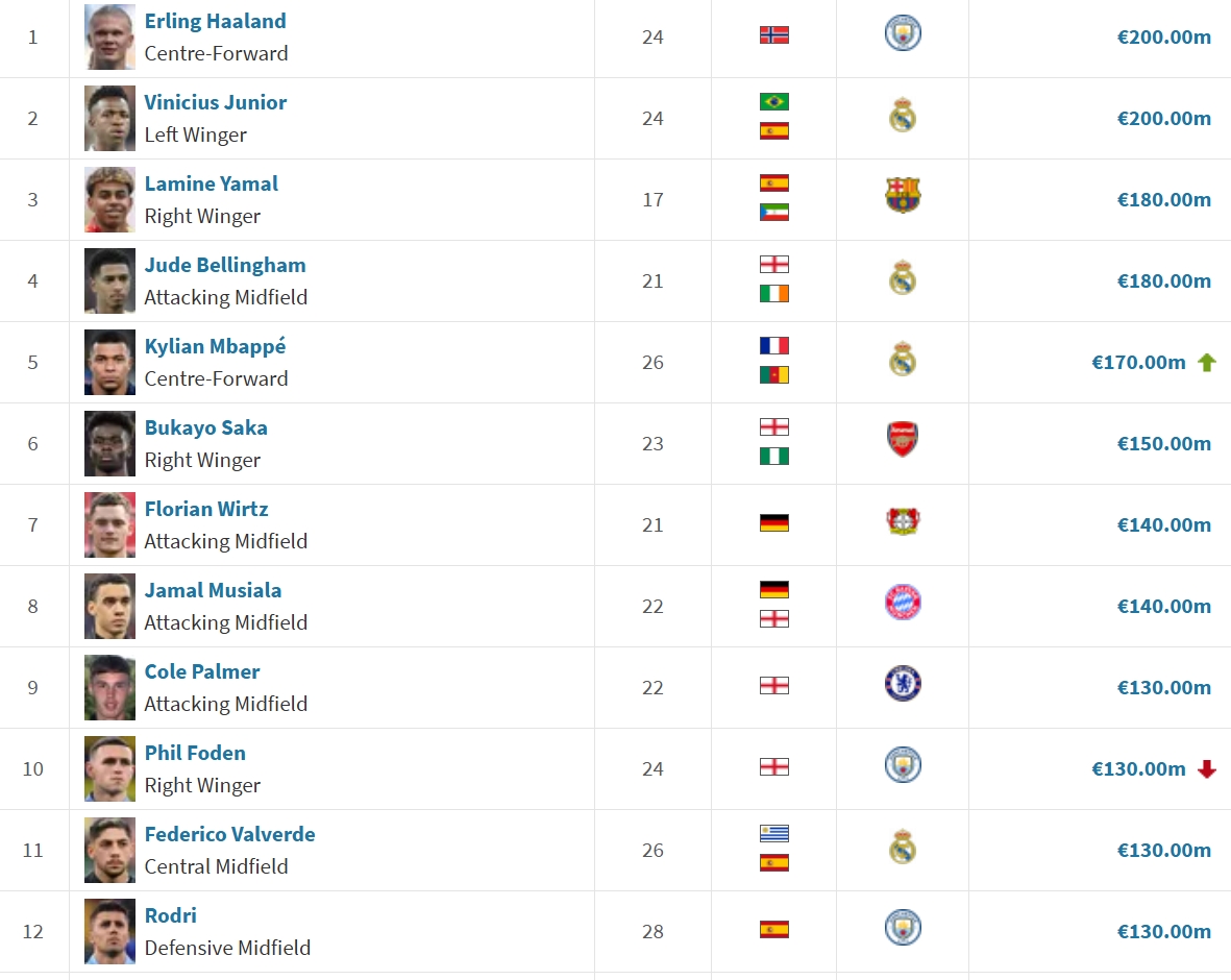 9.帕爾默、福登、巴爾韋德、羅德里 1.3億歐