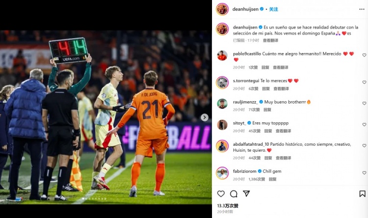 3月22日訊 西班牙在歐國聯八強戰首回合2-2戰平荷蘭,西班牙19歲中衛懷森替補完成首秀。他也在賽后通過社媒曬出自己的替補登場照,并配文:“為國家隊完成首秀就是夢想成真。我們周日再見,西班牙!” 本文標簽: 足球 英超 伯恩茅斯 西甲 國家隊 西班牙 荷蘭