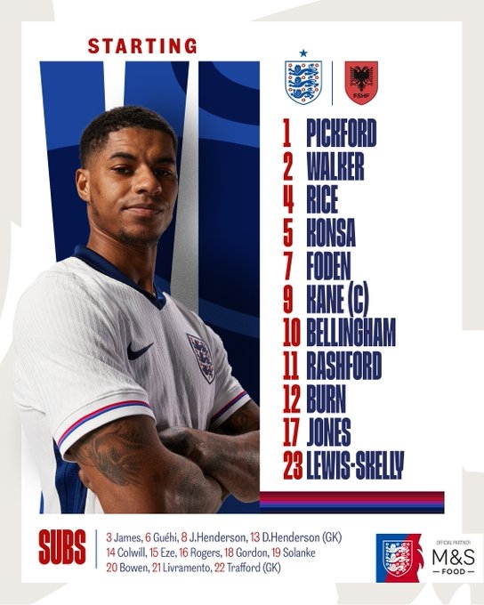 英格蘭首發:1-皮克福德、2-沃克、5-孔薩、12-丹-伯恩、23-斯凱利、4-賴斯、17-柯蒂斯-瓊斯、7-福登、10-貝林厄姆、11-拉什福德、9-凱恩