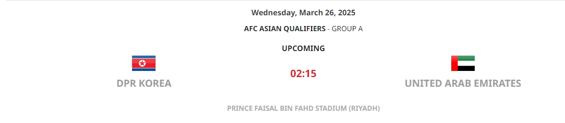 03月22日訊 亞足聯官網顯示,18強賽第8輪,朝鮮主場對陣阿聯酋的比賽將在沙特利雅得進行。比賽開球時間為北京時間3月26日02:15,比賽場地為費薩爾-本-法赫德王子體育場。世界杯亞洲區預選賽7輪比賽過后,朝鮮2平5負排在小組墊底,阿聯酋3勝1平3負,排在小組第三。 本文標簽: 足球 阿聯酋