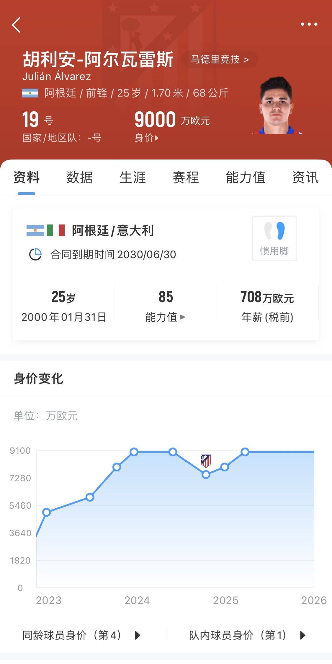 03月22日訊 昨日德轉(zhuǎn)更新西甲球員身價(jià),阿爾瓦雷斯的身價(jià)重新回到9000萬(wàn)歐,但沒(méi)有破億。