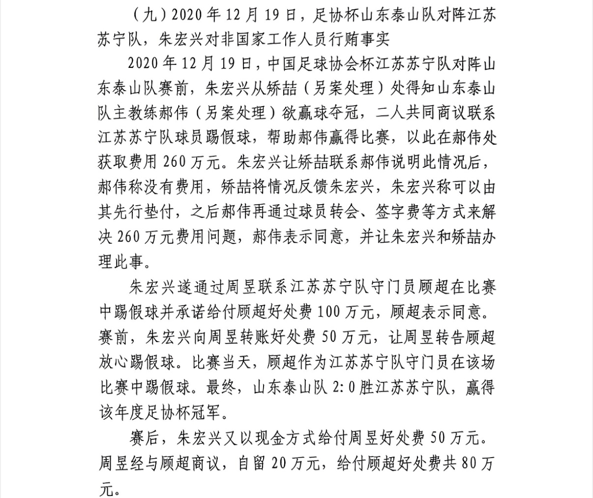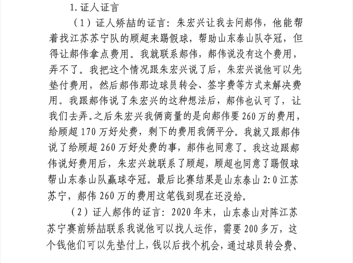 矯喆的證言:朱宏興讓我去問郝偉,他能幫著找江蘇蘇寧隊的顧超來踢假球,幫助山東泰山隊奪冠,但得讓郝偉拿點費用。我就聯系郝偉,郝偉說沒有這個費用,弄不了。我把這個情況跟朱宏興說了后,朱宏興說他可以先墊付費用,然后郝偉那邊球員轉會、簽字費等方式來解決費用。我跟郝偉說了朱宏興的這種想法后,郝偉也認可了,讓我們去弄。之后朱宏興我倆商量的是向郝偉要260萬的費用,給顧超170萬好處費,剩下的費用我倆平分。我就又跟郝偉說了給顧超260萬好處費的事,郝偉也同意了。我這邊跟郝偉說好費用后,朱宏興就聯系了顧超,顧超也同意了踢假球幫山東泰山隊贏球奪冠。最后比賽結果是山東泰山2:0江蘇蘇寧,郝偉260萬的費用這筆錢到現在還沒給。