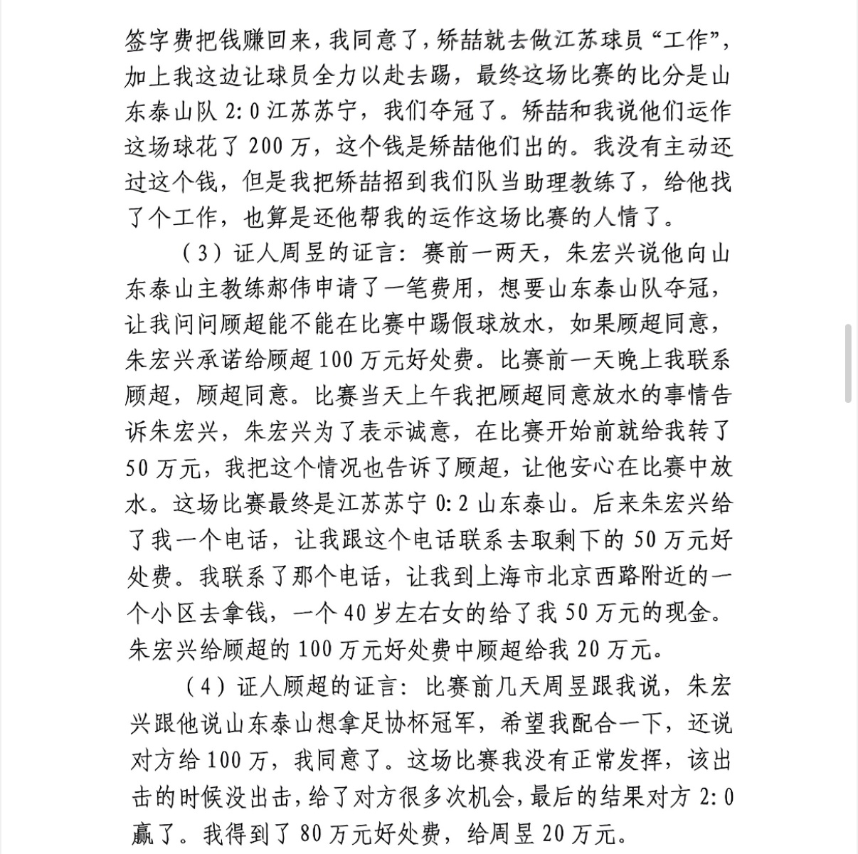 周昱的證言:賽前一兩天,朱宏興說他向山東泰山主教練郝偉申請了一筆費用,想要山東泰山隊奪冠,讓我問問顧超能不能在比賽中踢假球放水,如果顧超同意,朱宏興承諾給顧超100萬元好處費。比賽前一天晚上我聯系顧超,顧超同意。比賽當天上午我把顧超同意放水的事情告訴朱宏興,朱宏興為了表示誠意,在比賽開始前就給我轉了50萬元,我把這個情況也告訴了顧超,讓他安心在比賽中放水。這場比賽最終是江蘇蘇寧0:2山東泰山。后來朱宏興給了我一個電話,讓我跟這個電話聯系去取剩下的50萬元好處費。我聯系了那個電話,讓我到上海市北京西路附近的一個小區去拿錢,一個40歲左右女的給了我50萬元的現金。朱宏興給顧超的100萬元好處費中顧超給我20萬元。