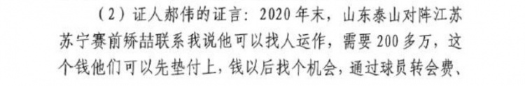 2020年末,山東泰山對(duì)陣江蘇蘇寧賽前矯喆聯(lián)系我說他可以找人運(yùn)作,需要200多萬,這個(gè)錢他們可以先墊付上,錢以后找個(gè)機(jī)會(huì),通過球員轉(zhuǎn)會(huì)費(fèi)、簽字費(fèi)把錢賺回來,我同意了,矯喆就去做江蘇球員“工作”,加上我這邊讓球員全力以赴去踢,最終這場(chǎng)比賽的比分是山東泰山隊(duì)2-0江蘇蘇寧,我們(足協(xié)杯)奪冠了。矯喆和我說他們運(yùn)作這場(chǎng)球花了200萬,這個(gè)錢是矯喆他們出的。我沒有主動(dòng)還過這個(gè)錢,但是我把矯喆招到我們隊(duì)當(dāng)助理教練了,給他找了個(gè)工作,也算是還他幫我的運(yùn)作這場(chǎng)比賽的人情了。