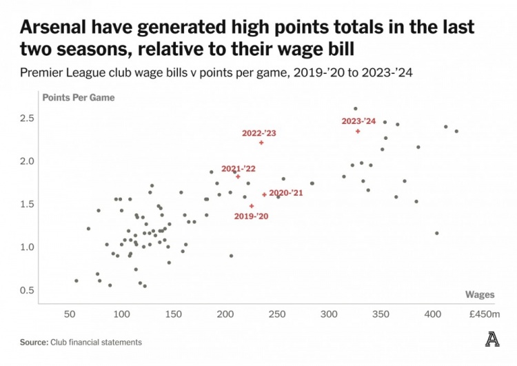 這也只是部分說明了這一成就。想想看,在這兩個賽季里,阿森納似乎就是曼城在爭冠道路上唯一的對手。尤其是在2022/2023賽季之時,他們的工資賬單與冠軍球隊曼城的工資根本就不在一個級別。在曼城奪得三冠王的那個賽季,他們的工資賬單比阿森納高出了1.88億英鎊。但在上賽季,這一差距明顯縮小(盡管仍有8500萬英鎊的差距)。一方面是曼城的員工成本略有下降,而阿森納的員工成本大幅提升。