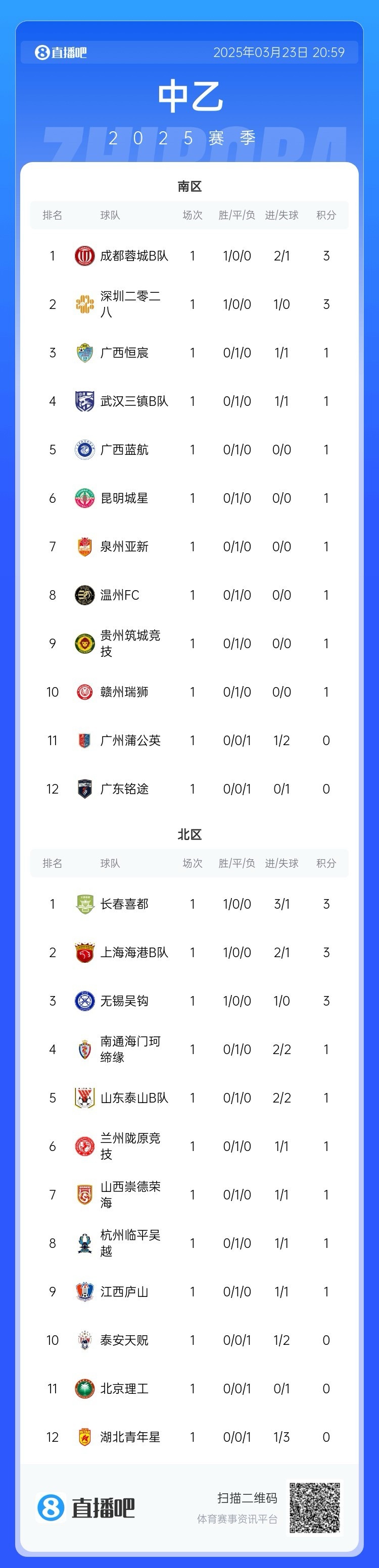 3月23日訊 中乙聯(lián)賽第一輪今天結(jié)束全部爭奪,蓉城B隊2-1擊敗廣州蒲公英,三鎮(zhèn)B隊?wèi)?zhàn)平廣西恒宸,無錫吳鉤、長春喜都、深圳二零二八收獲開門紅。