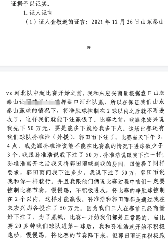 昨日網傳足壇假賭黑判決書,2021年12月26日山東泰山隊2-0河北隊的比賽中,金敬道和孫準浩、郭田雨下注買球。