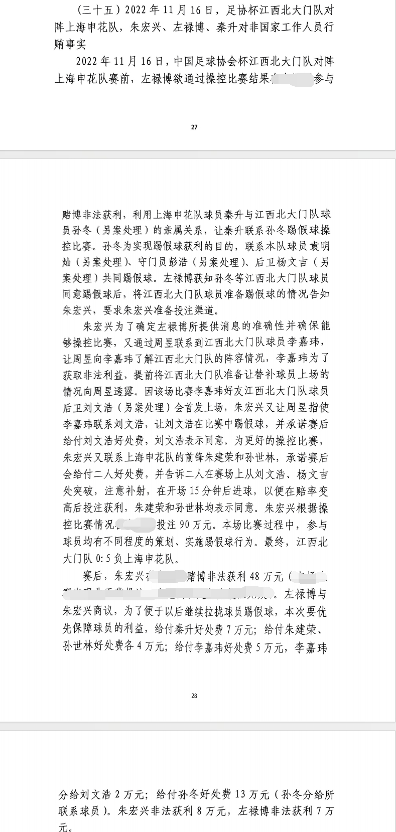 朱宏興為了確定左祿博所提供消息的準(zhǔn)確性并確保能夠操控比賽,又通過周星聯(lián)系到江西北大門隊(duì)球員李嘉瑋,讓周星向李嘉瑋了解江西北大門隊(duì)的陣容情況,李嘉瑋為了獲取非法利益,提前將江西北大門隊(duì)準(zhǔn)備讓替補(bǔ)球員上場的情況向周星透露。因該場比賽李嘉瑋好友江西北大門隊(duì)球員后衛(wèi)劉文浩(另案處理)會(huì)首發(fā)上場,朱宏興又讓周星指使李嘉瑋聯(lián)系劉文浩,讓劉文浩在比賽中踢假球,并承諾賽后給付劉文浩好處費(fèi),劉文浩表示同意。為更好的操控比賽,朱宏興又聯(lián)系上海申花隊(duì)的前鋒朱建榮和孫世林,承諾賽后會(huì)給付二人好處費(fèi),并告訴二人在賽場上從劉文浩、楊文吉處突破,注意補(bǔ)射,在開場15分鐘后進(jìn)球,以便在賠率變高后投注獲利,朱建榮和孫世林均表示同意。朱宏興根據(jù)操控比賽情況在投注90萬元。本場比賽過程中,參與球員均有不同程度的策劃、實(shí)施踢假球行為。最終,江西北大門隊(duì)0-5負(fù)上海申花隊(duì)。