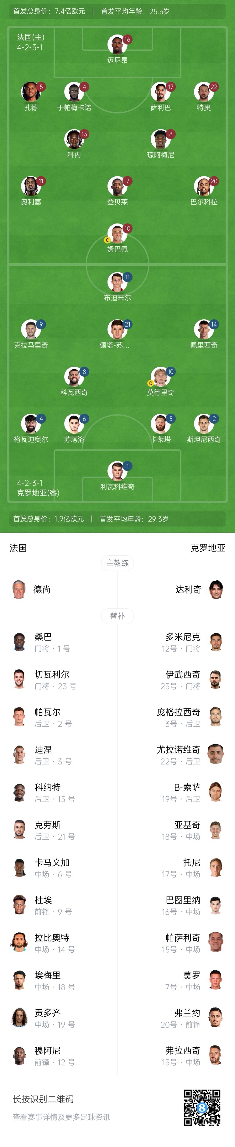 法國首發:16-邁尼昂、5-孔德、4-于帕梅卡諾、17-薩利巴、22-特奧、13-科內、8-瓊阿梅尼、11-奧利塞、7-登貝萊、20-巴爾科拉、10-姆巴佩