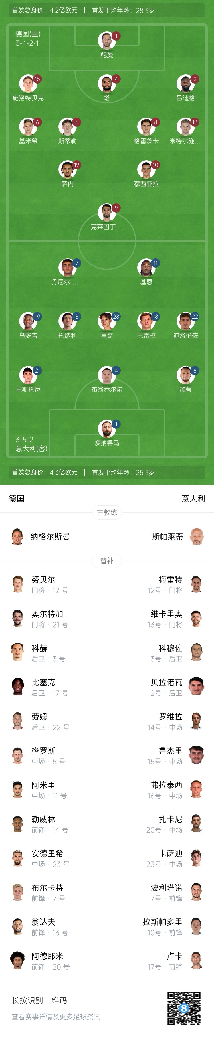 3月24日訊 歐國聯1/4決賽次回合,德國vs意大利首發出爐。陣容更新中。首回合對陣,德國2-1意大利。