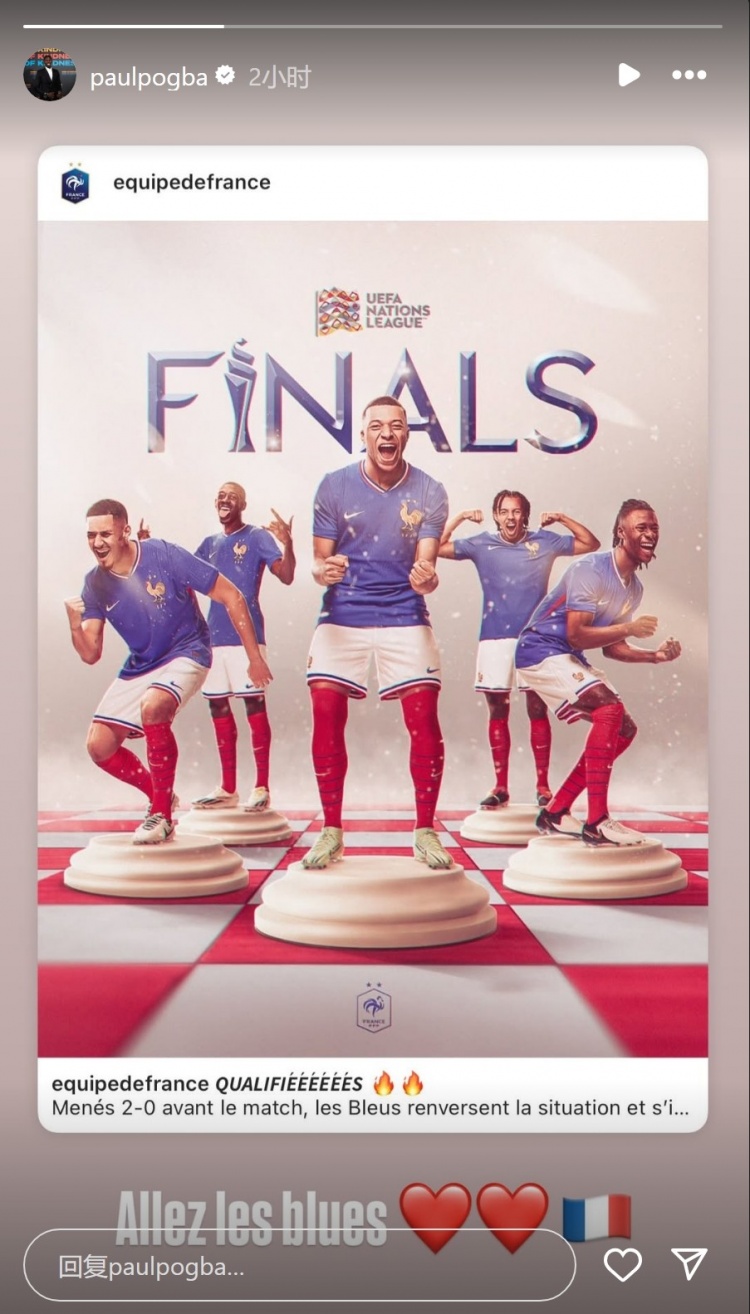 3月24日訊 歐國聯1/4決賽次回合比賽,法國2-0克羅地亞,兩回合總比分2-2戰平,最終法國在點球大戰中取勝,晉級下一輪。博格巴更新社媒動態,曬出法國隊的海報,祝賀球隊晉級,配文:“加油藍衣軍團!”博格巴職業生涯至今為法國隊出戰91場比賽,打進11球,助攻9次,幫助球隊贏得2018年世界杯冠軍。博格巴禁賽期結束后尚未找到球隊,目前在邁阿密自主訓練。 本文標簽: 足球 法國
