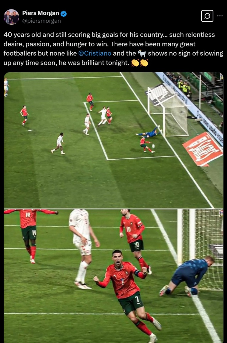 3月24日訊 歐國聯1/4決賽次回合,葡萄牙加時5-2擊敗丹麥,總比分5-3晉級。本場比賽,C羅破門。賽后,英國名嘴摩根接連發推,稱贊C羅的表現。摩根寫道:40歲了,依然能為國家隊取得關鍵進球……他彰顯了如此不懈的渴望、激情和對勝利的饑餓感。偉大的球員有很多,但沒有一個能像C羅一樣。并且,GOAT(歷史最佳球員)沒有任何跡象表明他會很快放慢腳步,他今晚表現得非常出色。???? 本文標簽: 足球 C羅 葡萄牙