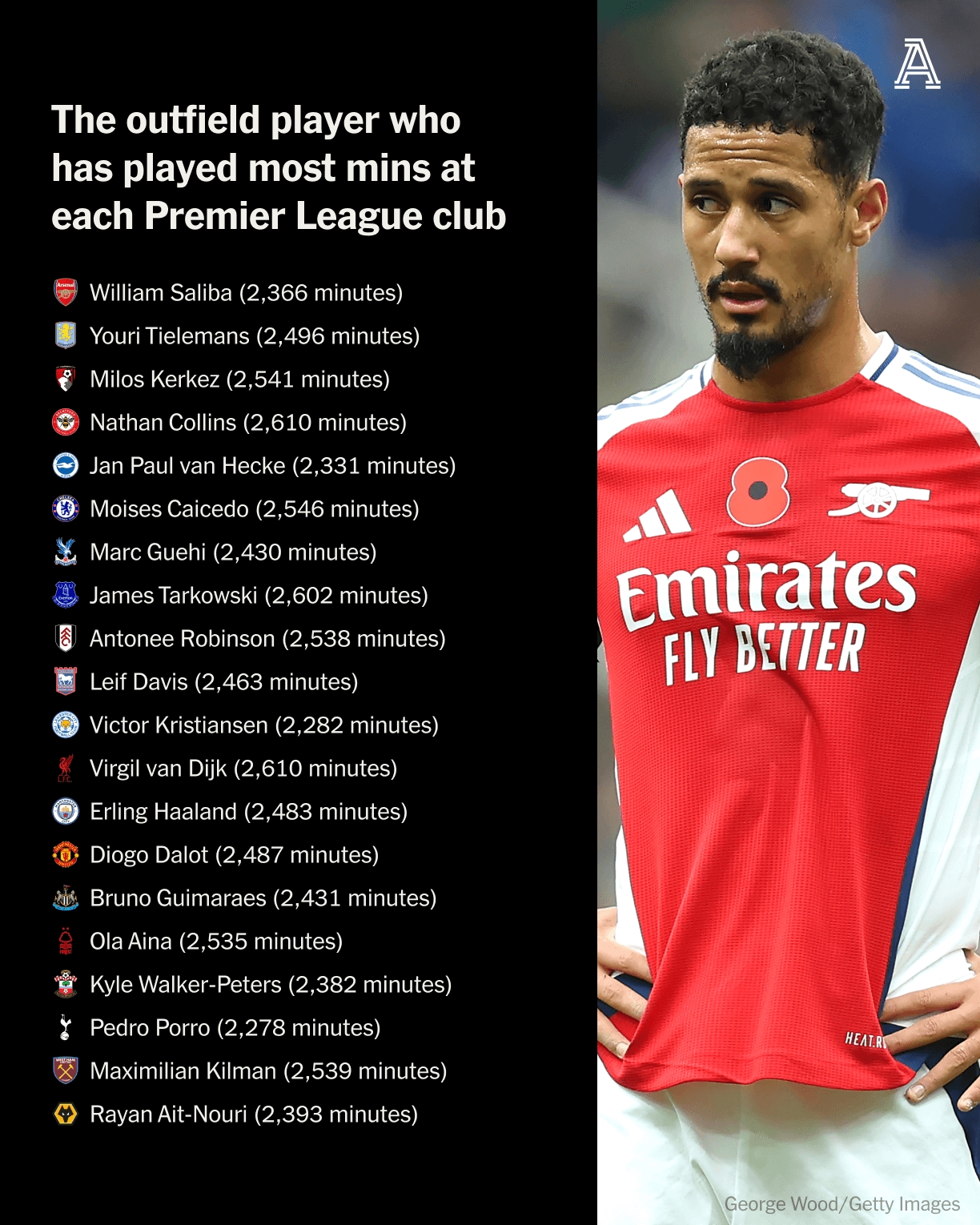 03月24日訊 The Athletic統計了本賽季英超各隊出場時間最多的外場(非門將)球員,薩利巴、范迪克、哈蘭德、達洛特、凱塞多在列。