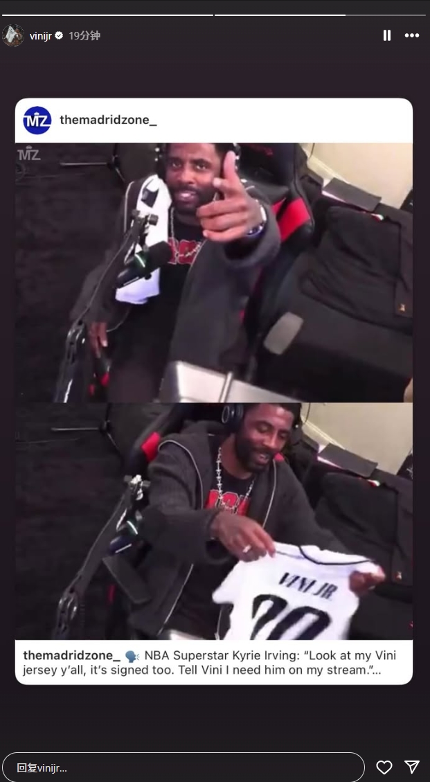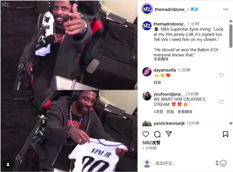 維尼修斯社媒截圖03月24日訊 NBA球星凱里歐文近日開啟直播,期間他為維尼修斯發聲。歐文曬出了維尼修斯的簽名球衣,表示:“你們看看我的維尼修斯球衣,這是簽了名的。告訴他我需要它出現在直播里。他本該獲得金球獎,每個人都清楚。”維尼修斯轉載原帖截圖 本文標簽: 足球 西甲 皇家馬德里