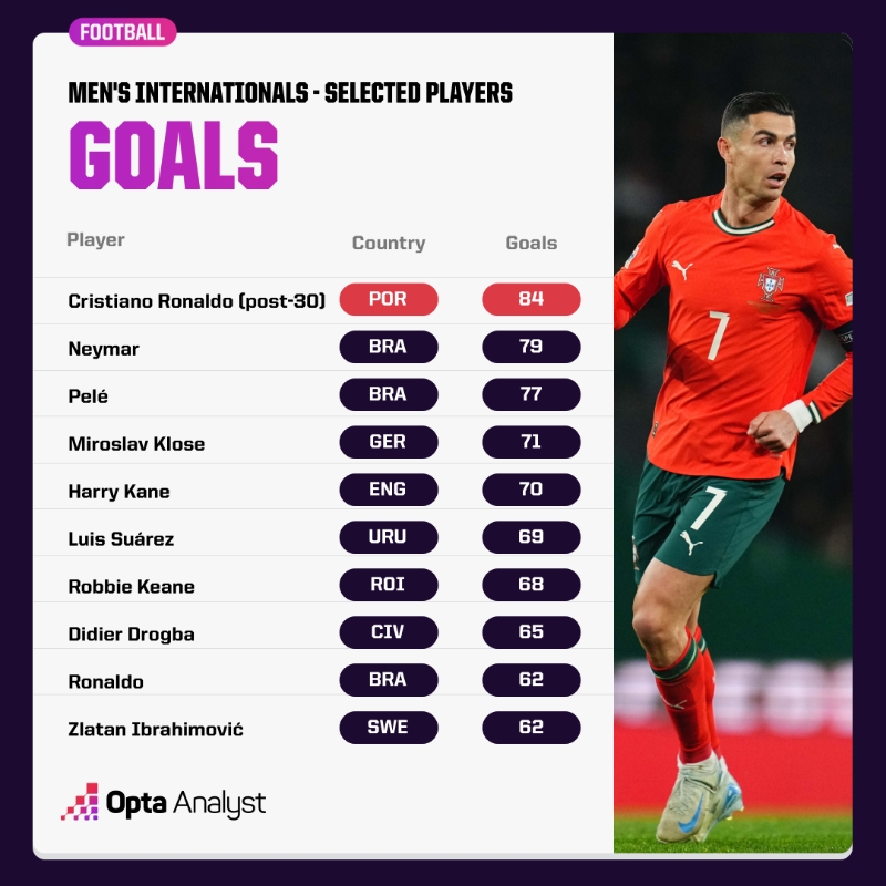 03月25日訊 在昨天結(jié)束的歐國聯(lián)1/4決賽,葡萄牙對陣丹麥的比賽中,比賽第73分鐘,C羅為葡萄牙攻入1球。據(jù)opta統(tǒng)計(jì),30歲后C羅國家隊(duì)打入84球超眾多球星的國家隊(duì)進(jìn)球數(shù),包括巴西內(nèi)馬爾的79粒、德國隊(duì)克洛澤的71粒、英格蘭隊(duì)凱恩的70粒等。