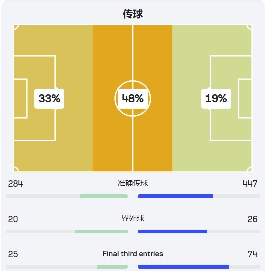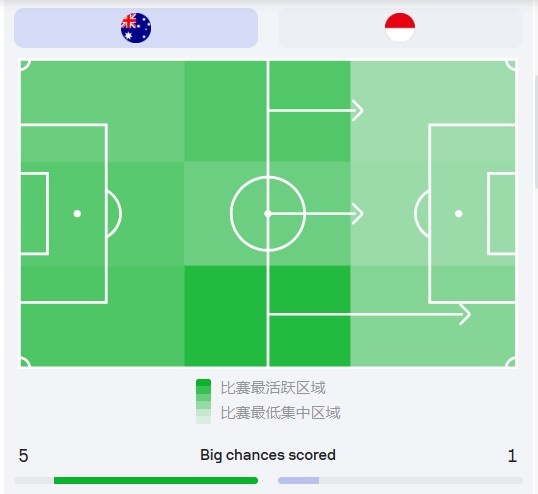 澳大利亞玩的就是效率,控球率、進攻三區(qū)進入次數(shù)比印尼還少,可比分卻是大勝(藍色方為印尼)