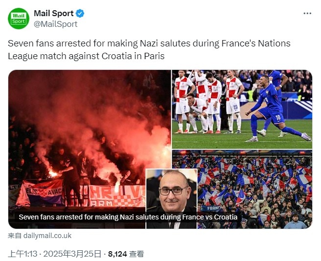 3月25日訊 《每日郵報》報道,巴黎當局證實,七名在法國vs克羅地亞的歐國聯比賽中行納粹禮的球迷已被拘留。