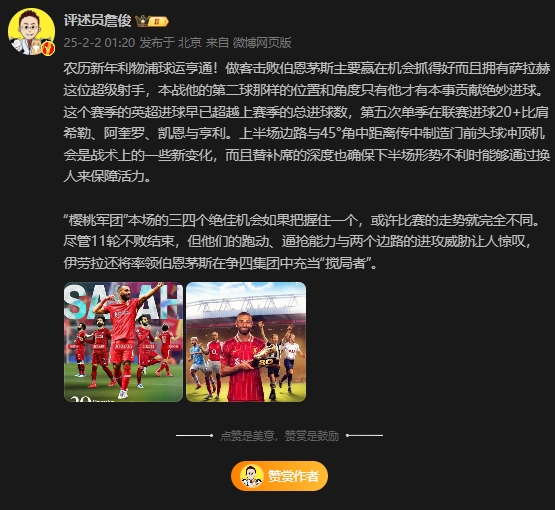 02月02日訊 本輪英超,利物浦客場2-0戰(zhàn)勝伯恩茅斯,賽后著名評述員詹俊在社媒做出點(diǎn)評。