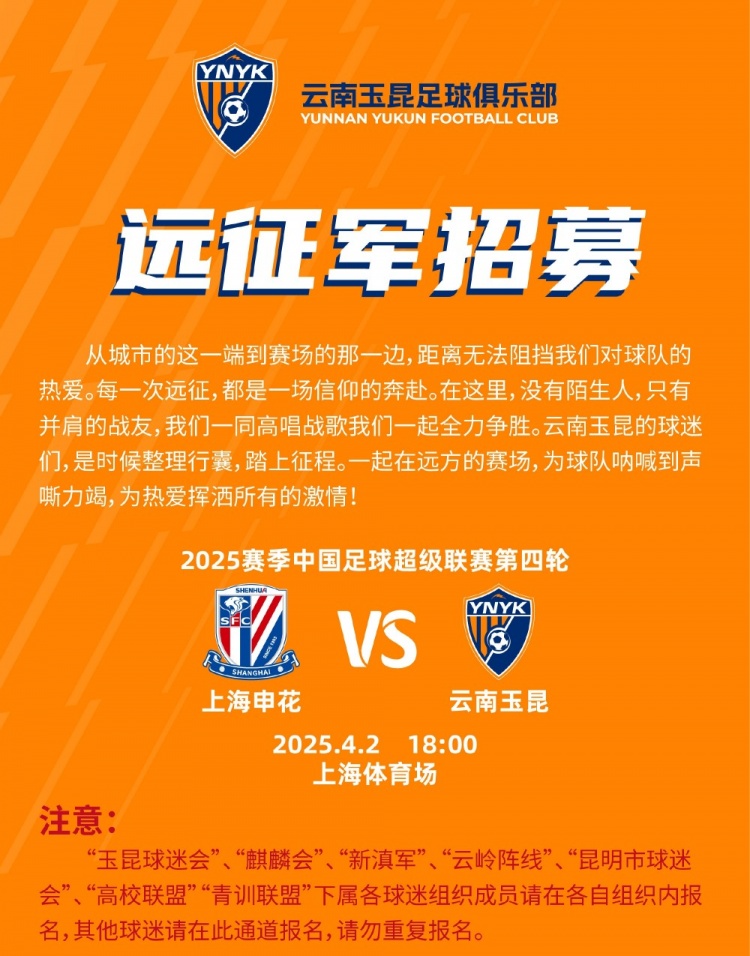中超第4輪云南玉昆將客場挑戰上海申花,球迷遠征報名已正式開啟
