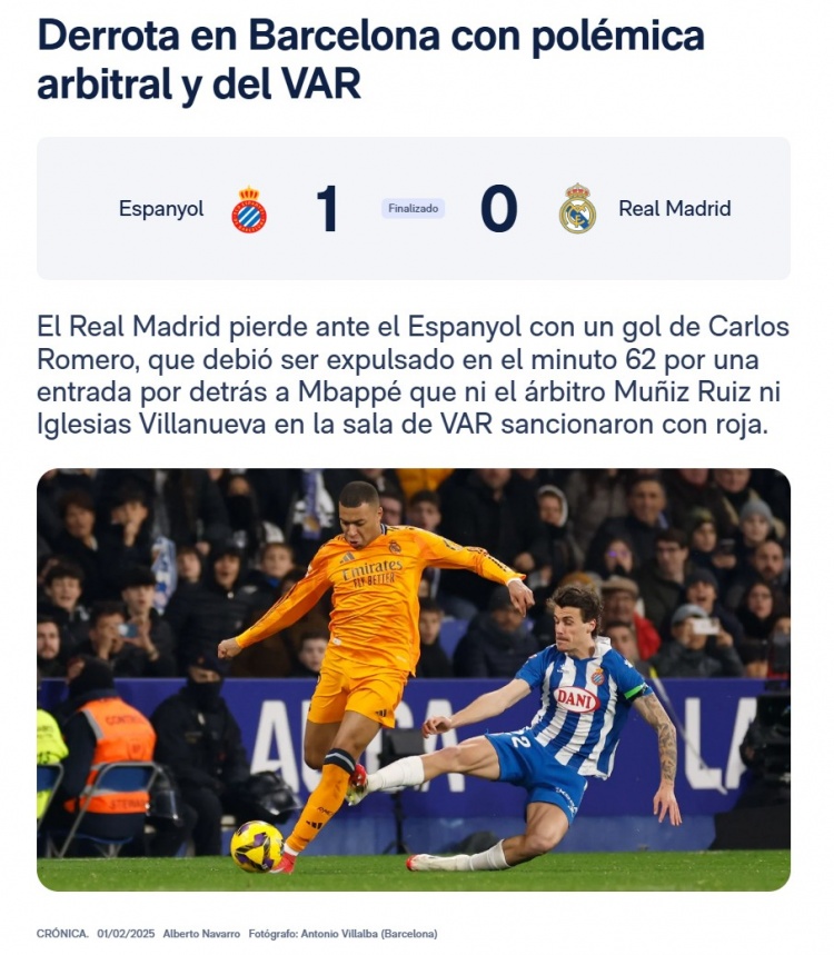 皇馬因?yàn)榭逅?羅梅羅的進(jìn)球輸給了西班牙人,而羅梅羅本應(yīng)在第62分鐘因背后鏟倒姆巴佩被罰下場(chǎng),但主裁判穆尼茲-魯伊斯和VAR室的伊格萊西亞斯-比利亞努埃瓦都沒(méi)有給他紅牌。