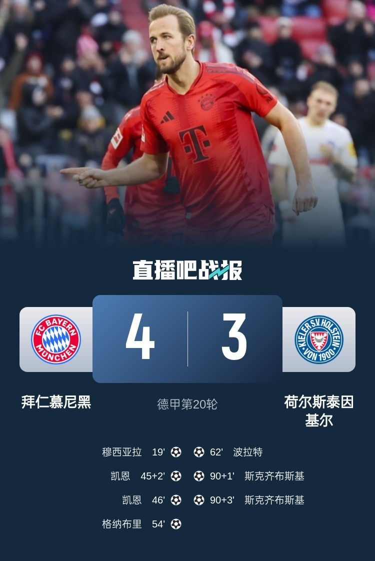 凱恩雙響,拜仁4-3力克基爾迎來德甲6連勝,多賽一場領先第二的勒沃庫森9分。