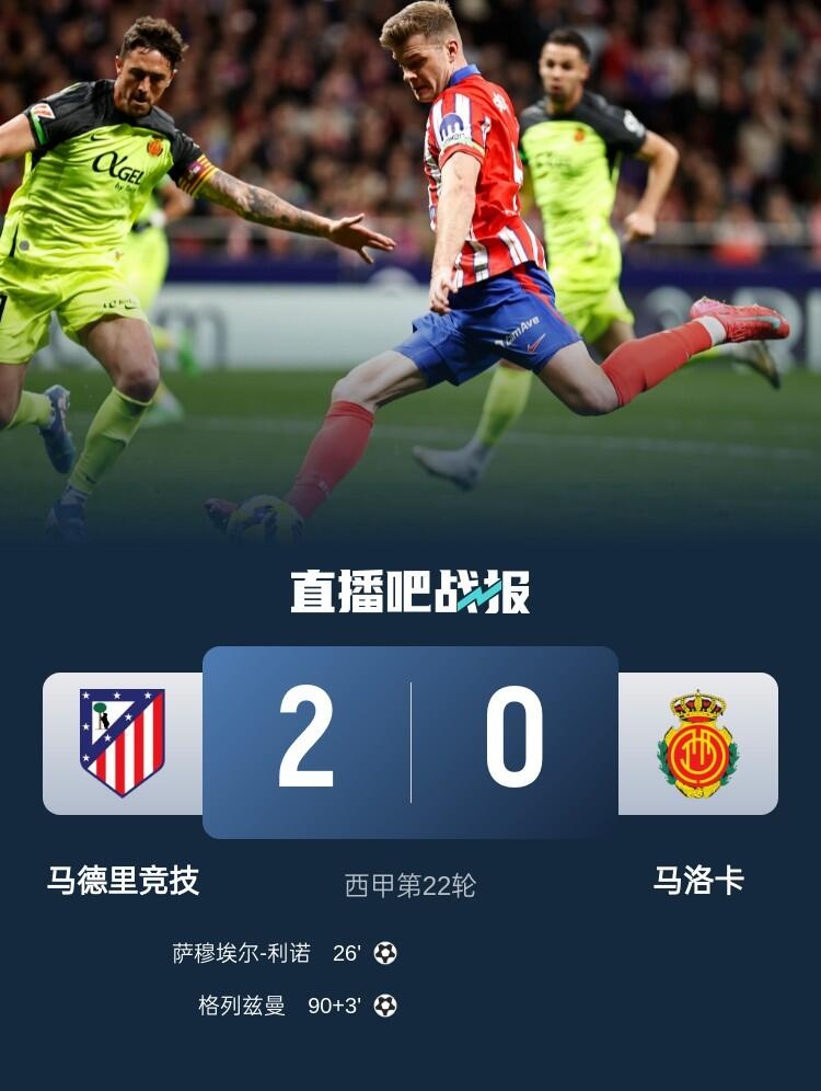 西甲-馬競2-0馬洛卡先賽距榜首1分 利諾建功格列茲曼吊射破門