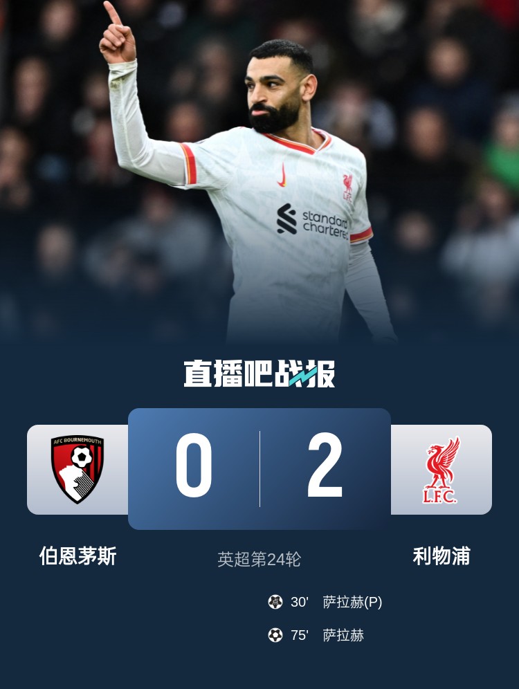 薩拉赫梅開二度,利物浦2-0戰勝伯恩茅斯,9分領跑積分榜。