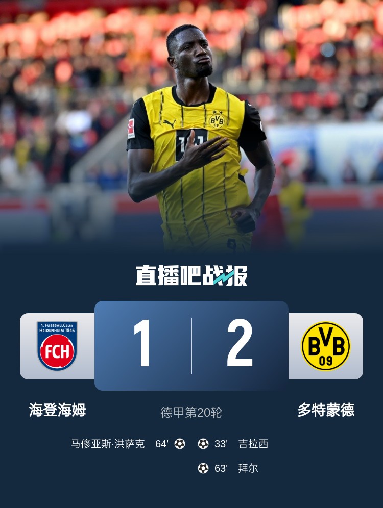 多特客場2-1擊敗海登海姆,結束4輪不勝。