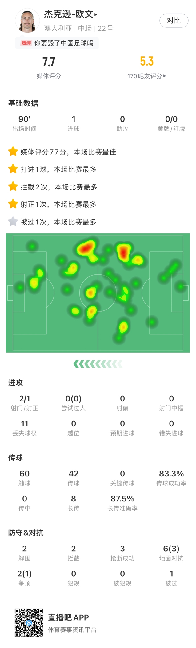 03月25日訊 世預(yù)賽亞洲區(qū)18強(qiáng)賽C組第8輪,國足主場0-2輸給澳大利亞,賽后杰克遜-歐文當(dāng)選全場最佳!歐文為澳大利亞打入了第一粒進(jìn)球:杰克遜-歐文本場數(shù)據(jù)↓ 本文標(biāo)簽: 足球 國家隊(duì) 中國男足 中國足球 澳大利亞
