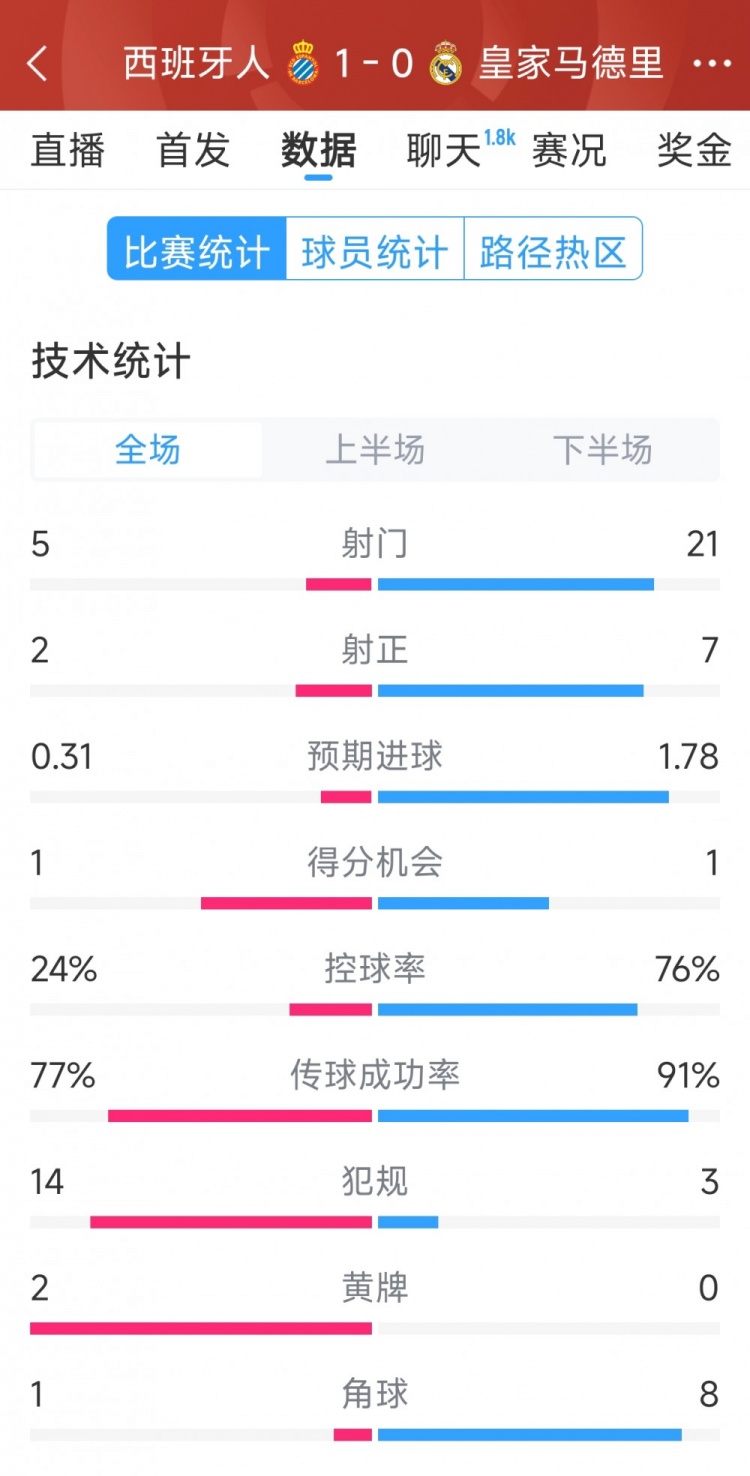 2月2日訊 在本輪西甲,皇馬0-1不敵西班牙人,以下為雙方全場(chǎng)數(shù)據(jù)對(duì)比:西班牙人vs皇馬射門:5-21射正:2-7預(yù)期進(jìn)球:0.31-1.78得分機(jī)會(huì):1-1控球率:24%-76%傳球成功率:77%-91%犯規(guī):14-3黃牌:2-0角球:1-8 本文標(biāo)簽: 足球 西甲 皇家馬德里