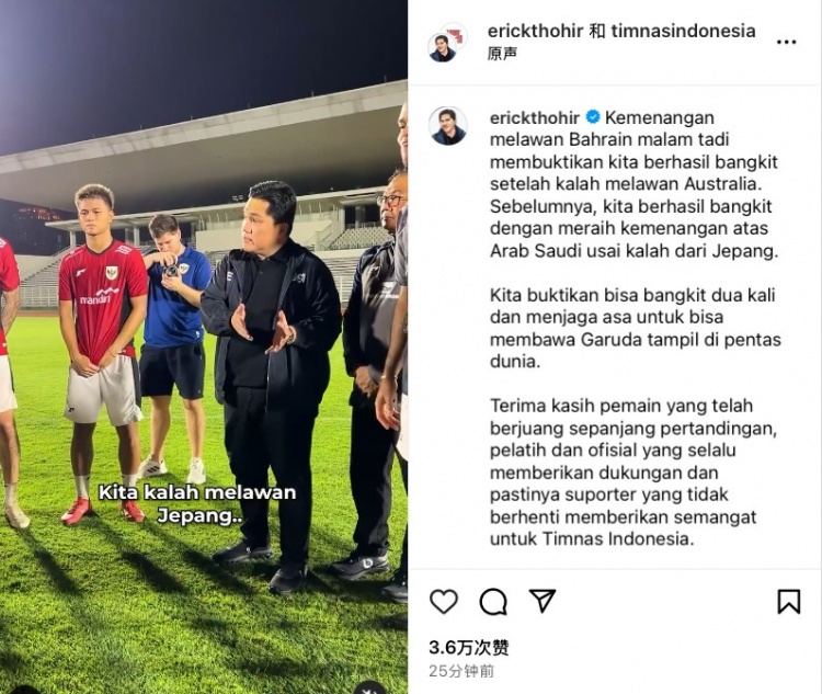 印尼足協主席托希爾在發社媒,這次他曬出了賽后他召集球員進行訓話的Vlog,視頻中托希爾說道:“此前我們在0-4慘敗日本隊后,回到主場我們2-0擊敗沙特隊;今天的情況類似,上輪我們慘敗后今天我們又擊敗了巴林隊。我希望你們接下來能繼續全力以赴。另外,我相信我們還在計劃當中:我們依舊保留通往世界杯的希望。”