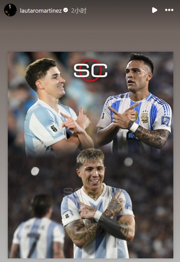 3月26日訊 在本輪南美區(qū)世預(yù)賽,阿根廷4-1大勝巴西。本場比賽勞塔羅因傷缺戰(zhàn),而阿爾瓦雷斯、恩佐在進(jìn)球后都做出了勞塔羅標(biāo)志性慶祝動作。勞塔羅也在個人社媒轉(zhuǎn)發(fā)了三人進(jìn)球后同樣的慶祝動作照片。 本文標(biāo)簽: 足球 國家隊(duì) 阿根廷 意甲 國際米蘭