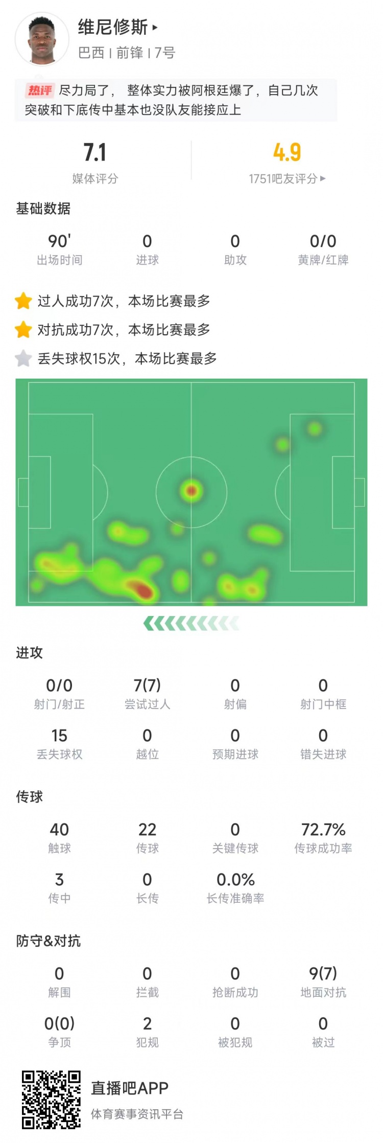 3月26日訊 南美世預賽第14輪比賽,維尼修斯為巴西踢滿全場,最終巴西客場1-4不敵阿根廷。維尼修斯本場比賽數據:出場時間——90分鐘射門——0嘗試過人——7(成功7)丟失球權——15觸球——40傳球——22傳球成功率——72.7%傳中——3地面對抗——9(成功7)犯規——2媒體評分——7.1 本文標簽: 足球 皇家馬德里 西甲 巴西