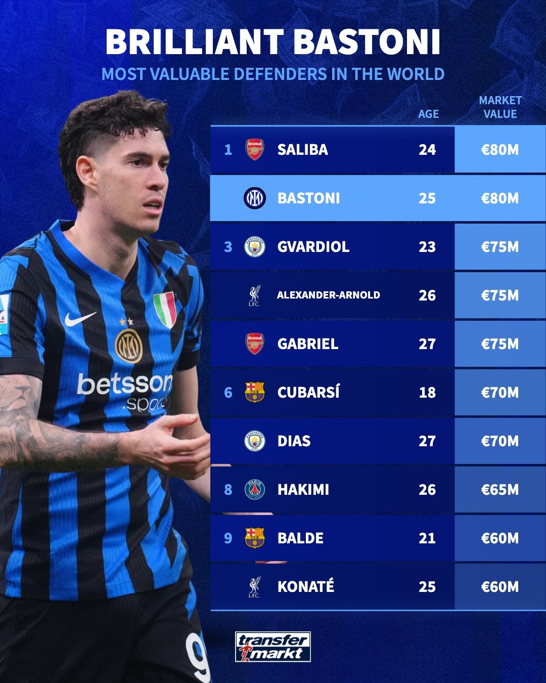 03月26日訊 德轉更新數據,最新足壇后衛身價排行榜出爐。巴斯托尼升至8000萬歐,并列第一。