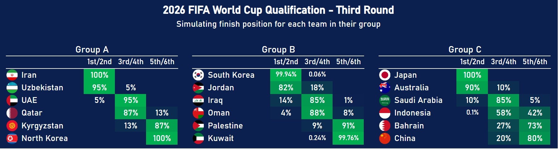 03月26日訊 數據機構Footy Rankings發布世預賽預測。其中中國隊20%排3/4(附加賽),80%排在5/6(無緣世界杯),而印尼58%概率獲得附加賽資格。 本文標簽: 足球 中國男足 中國足球 中超