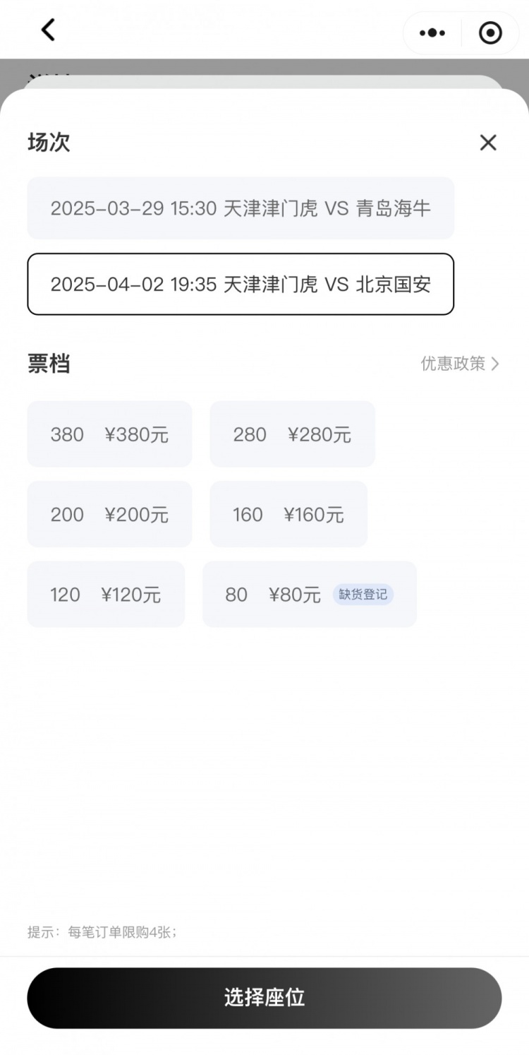 天津津門虎官方售票平臺信息顯示,本場比賽的門票開票后,僅有80元的最低價門票顯示缺貨,其他包括120元、160元、200元、280元、380元在內的多個檔位仍有大量余票可供購買。