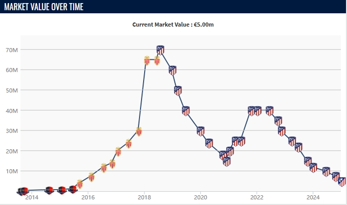 但在高價加盟馬競之后,勒馬爾的效率直線下滑,他也頻繁受到傷病困擾,身價一路走低,從巔峰時期的7000萬歐,掉到現在的500萬。