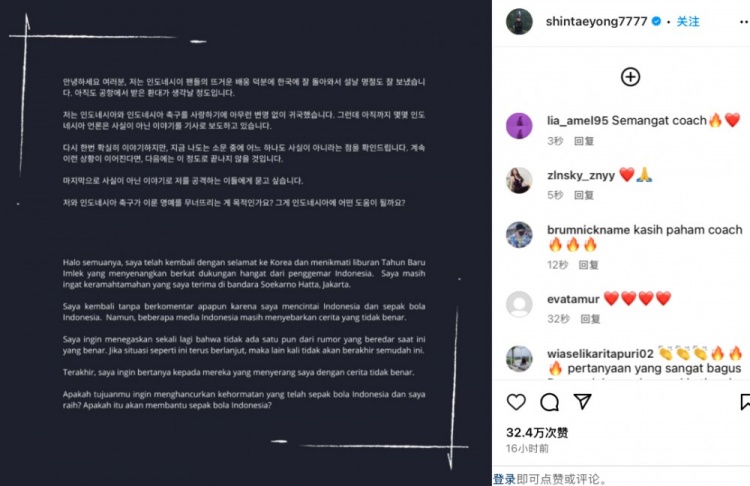 2月2日訊 今日前印尼主帥申臺龍更新社媒,用韓語和印度尼西亞語發布聲明,對部分印尼媒體進行警告。