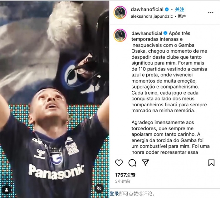 在轉會官宣后,達萬社媒發布視頻集錦,向大阪鋼巴球迷告別。他寫道:
