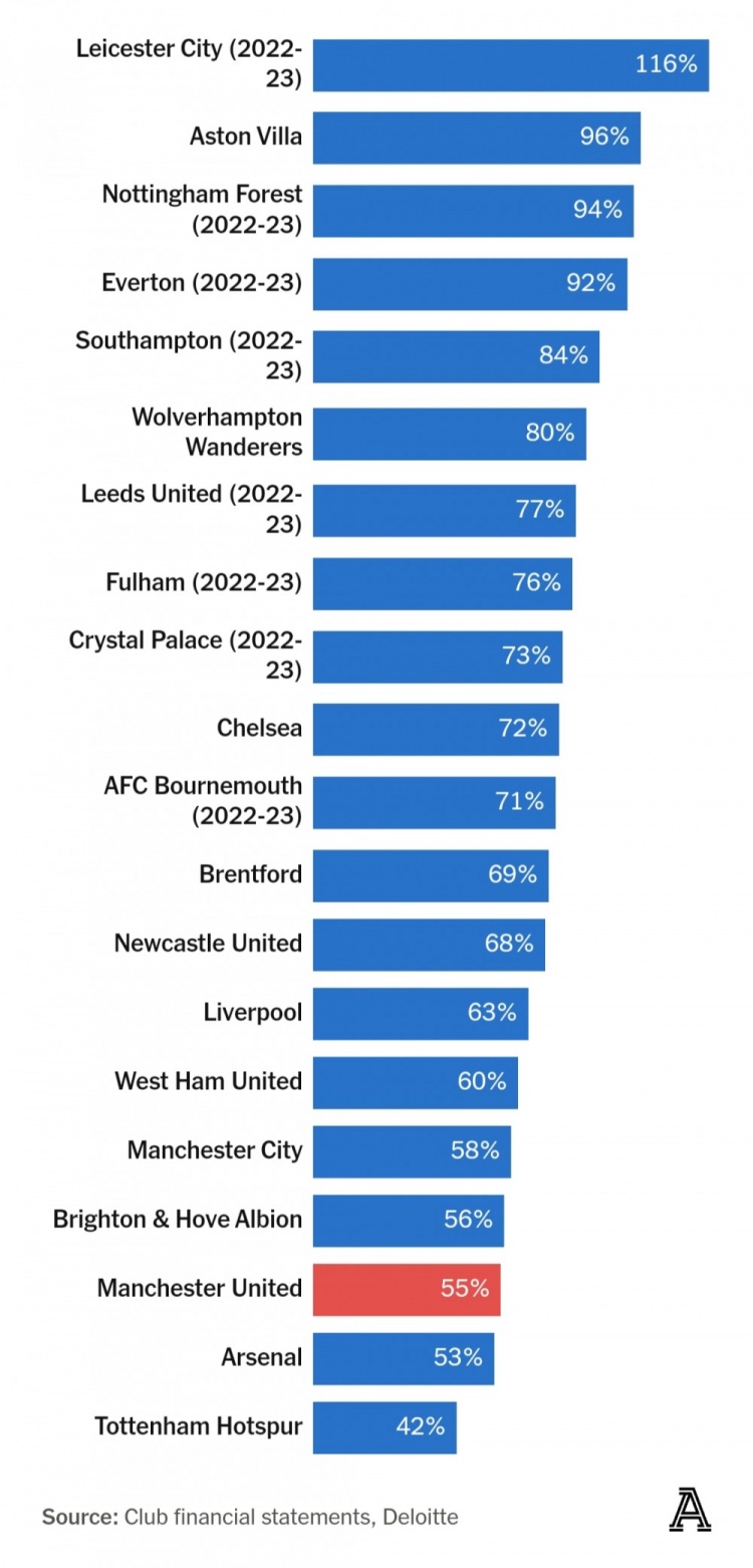 事實(shí)上,曼聯(lián)的工資收入比非常健康,是英超中工資占收入比例最低的俱樂部之一,多年來一直如此(如下圖)。問題在于,曼聯(lián)最好的球員、高薪的球員經(jīng)常上不了場(chǎng)。以盧克-肖為例,據(jù)匿名消息人士透露,這名球員在2023年4月同意續(xù)約4年,周薪約20萬鎊,還有額外獎(jiǎng)金。與其他曼聯(lián)球員一樣,如果球隊(duì)無緣歐冠,待遇會(huì)降低,但據(jù)說減薪幅度低于球隊(duì)標(biāo)準(zhǔn)的25%。