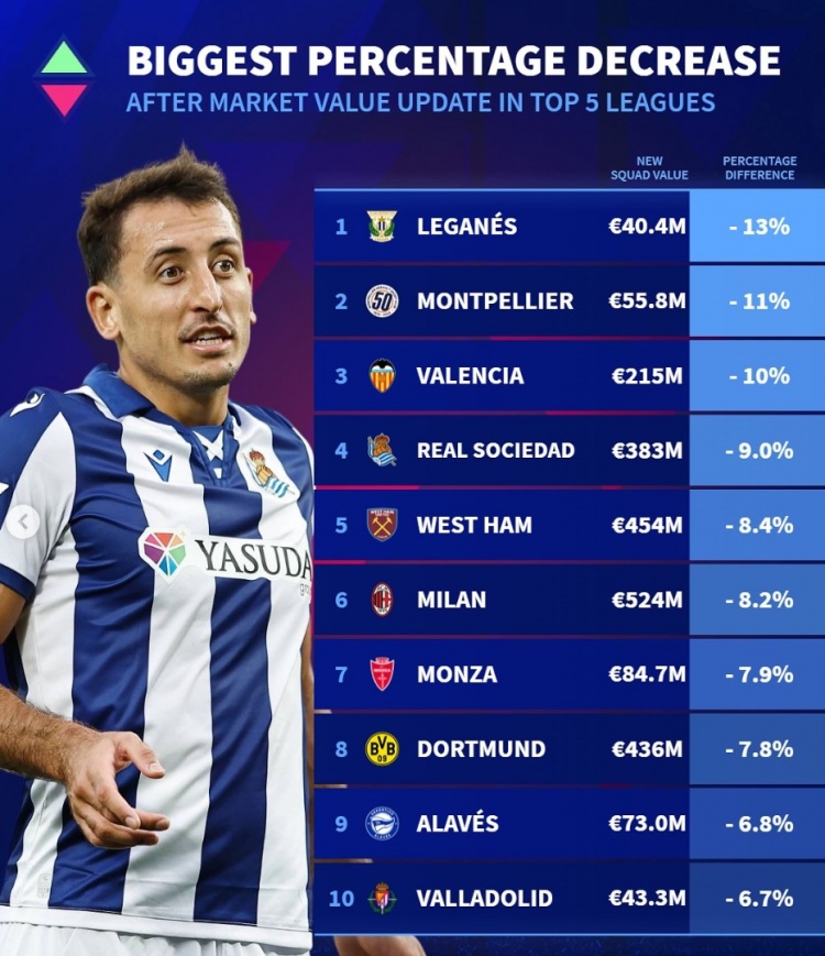 五大聯賽球隊身價貶值比例最高榜:歐元