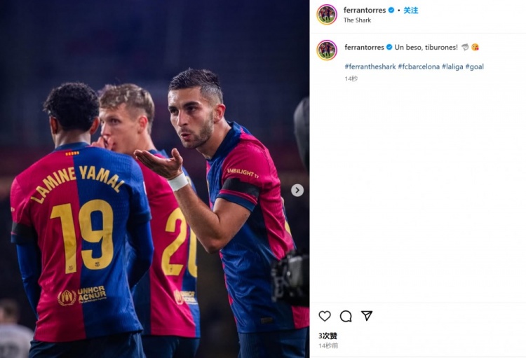 費(fèi)蘭-托雷斯在此前多次表示自己很崇尚自信而貪婪的“鯊魚精神”,他本賽季各項(xiàng)賽事為巴薩33場貢獻(xiàn)14球3助攻。